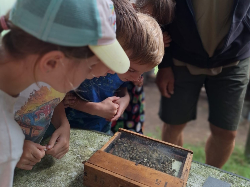 Dort lernten die Kindern viel über das Leben der Bienen und die Arbeit des Imkers. Alle durften selbst mit anpacken, z. B. den Smoker bedienen, Waben begutachten und einen Drohn (eine männliche Biene) auf die Hand nehmen.